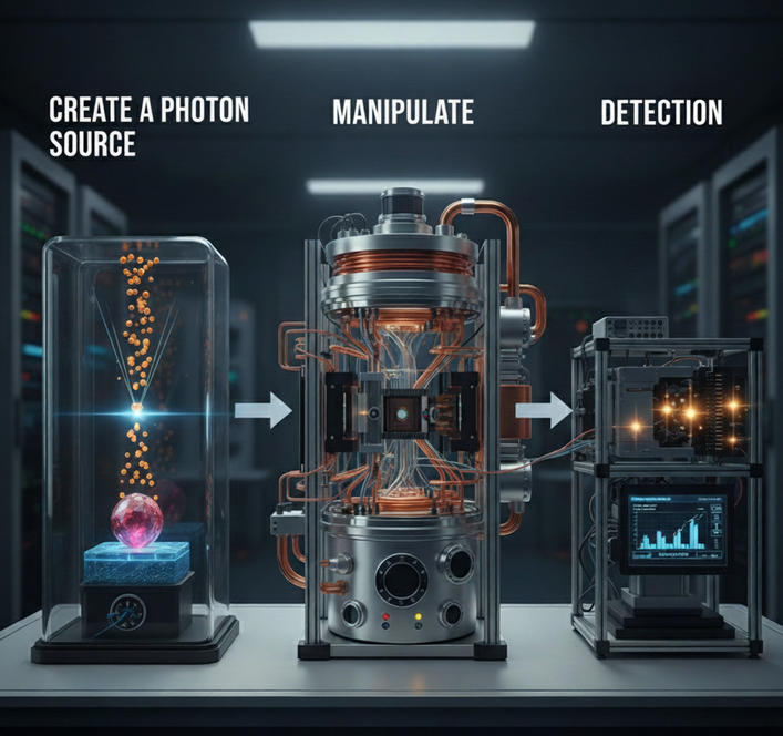 Generating a cluster state begins with phase one, where a high-fidelity photon source is engineered to emit the entanglement-ready particles required for the quantum lattice. This is followed by phases two and three, which utilize gate manipulation to weave the photons into a multi-partite entangled state before specialized detectors perform the measurements necessary for computation.